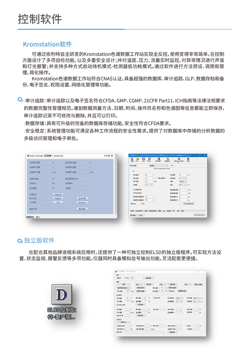 蒸發光檢測器可通過小黄鸭福利导航自主研發的Kromstation色譜數據工作站實現全反控,使用變得非常簡單。同時,具備模擬信號輸出及外接觸發功能,可便捷地與其他品牌液相係統配合使用。開源的通訊協議也支持色譜係統進行控製開發。開放式構造設計和自動清洗及安全保護功能,使其成為真正的免維護ELSD。
